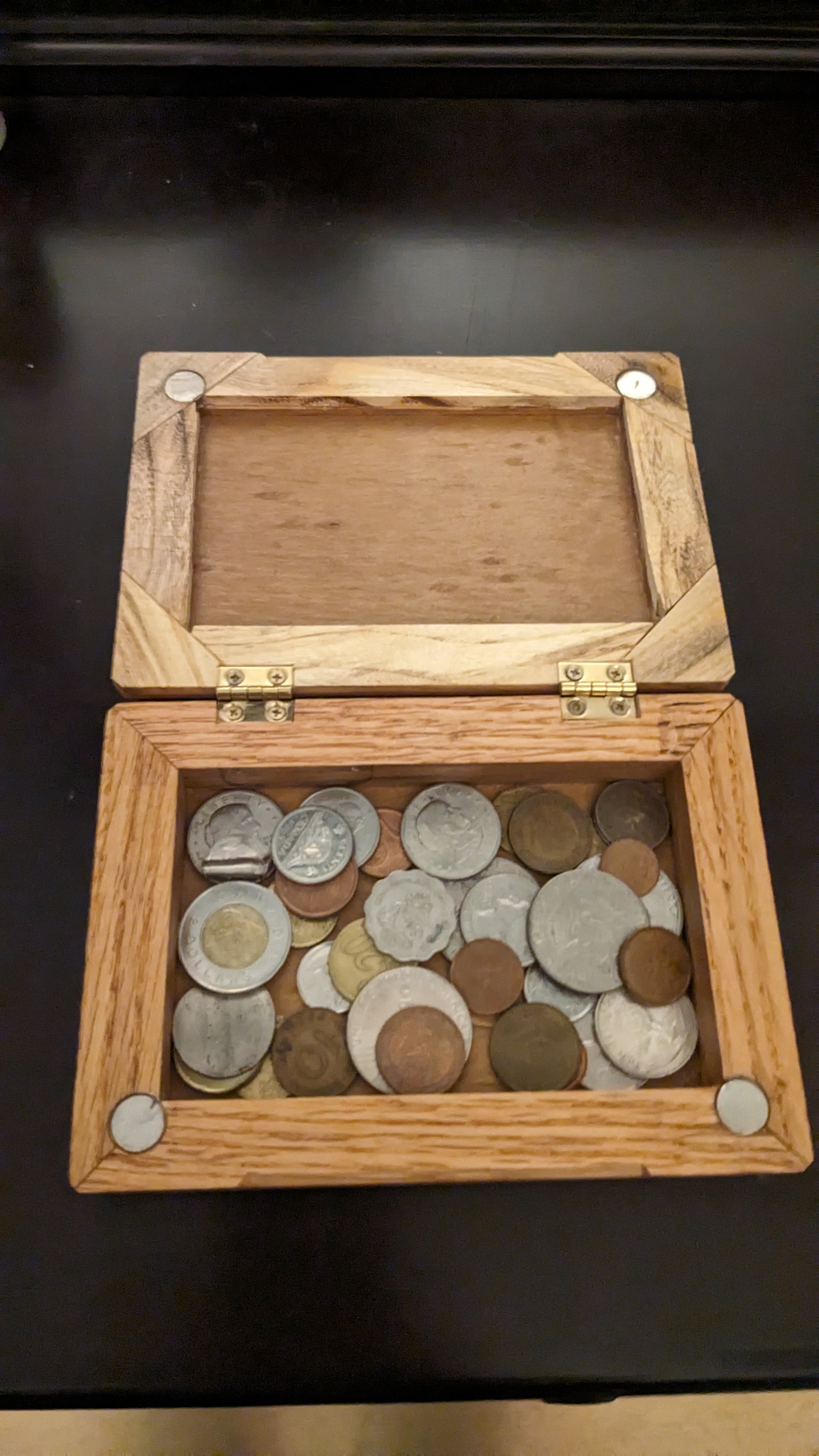 The final product sitting on the dresser with some coins that I’ve acquired over the years.