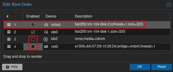 I am disabling cdrom and pxe boot since I have no idea what the use case would be for those. Our new disk is moved to the top. I’m pretty sure the ide drives can be deleted later to save space and complexity.