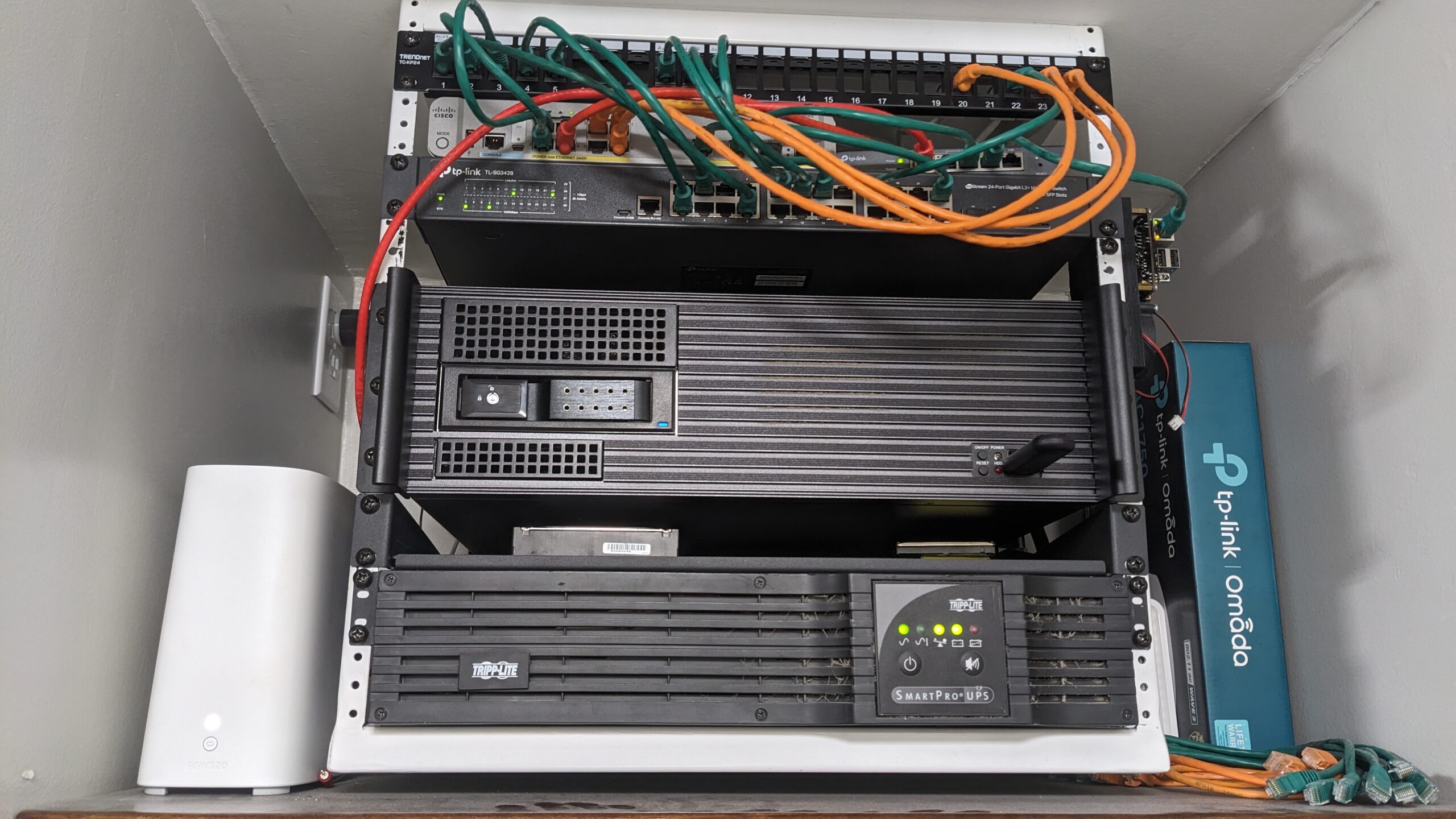 From top to bottom: 1 - patch panel 2L - Cisco 3560CX multi-gig POE+ switch. The backbone of the network. 2R - TP-Link Omada ER-605 Router. I wish I had gotten one with SFP to try and delete my AT&T router. 3 - TP-Link Omada TL-SG2428 24-port gigabit L2+ switch with 4x SFP. I wish I had sprung for multi-gig SFP+ ports for a fiber backbone to an upstairs switch. 3-4R - Banana Pi Pro. Running PiHole since it’s got GbE. 4-6 - My main franken-server 7 - Some spare HDDs. A HDD flapping in the breeze on a USB-SATA converter (to be upgraded to hot swap bays) 8-9 - TrippLite SMART3000RM2U. Swapped the fan to 2x Noctua fans (1 in regular slot, additional 3D print mount in front of the transformer). When everything is idling I end up pulling about 7% of the rated capacity of this thing. Runs on its own dedicated wiring and 30A breaker.