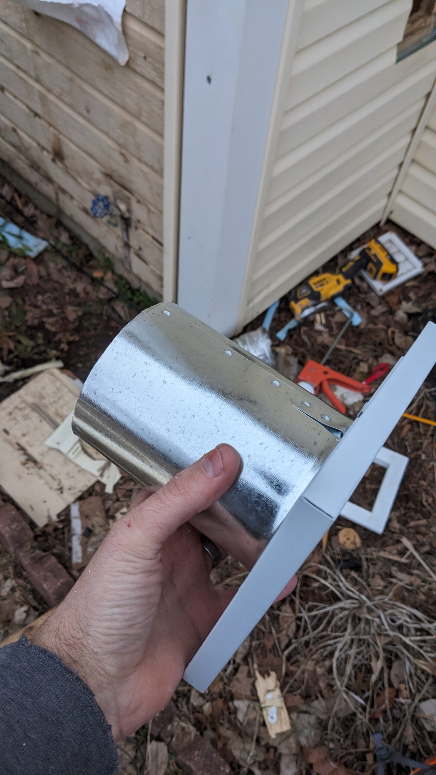 I want to rip off one small strip of siding above the air intake, re-trim it, and put in longer j-channel. But I need to order our siding from a specific supplier to match, and that will take a while to show up. A handle also needs to be installed onto the flap to make opening it easier.