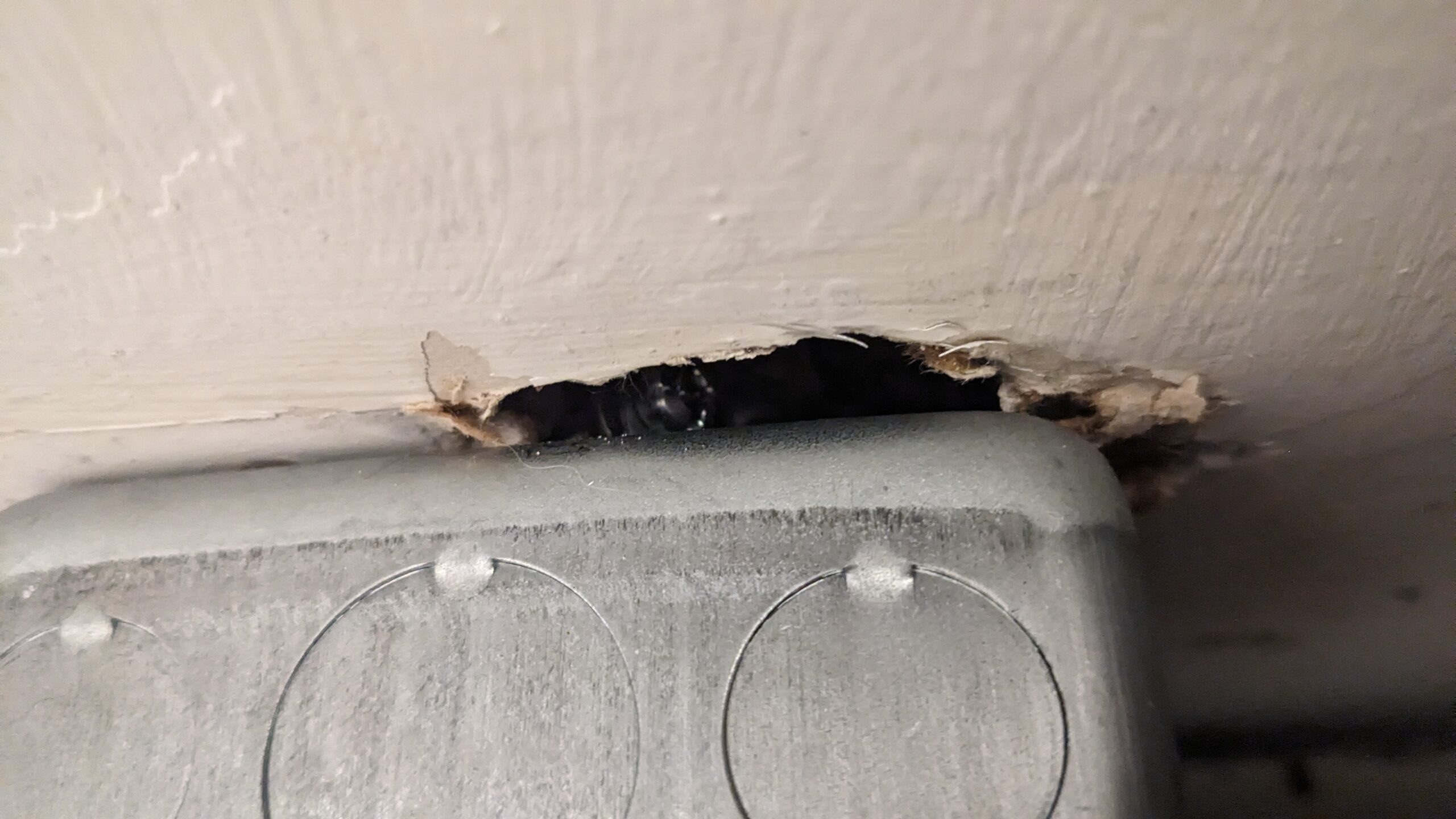 My wife made a comment about this receptacle when we were moving in. Specifically, that it looked like a fire hazard. I agreed to get rid of it, but mostly because I prefer something that mounts flush and doesn’t have exposed wire on my side of the drywall. I’m a bit of a purist when it comes to medium voltage inside the living space with only it’s own plastic sheath as protection…
