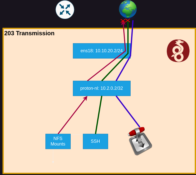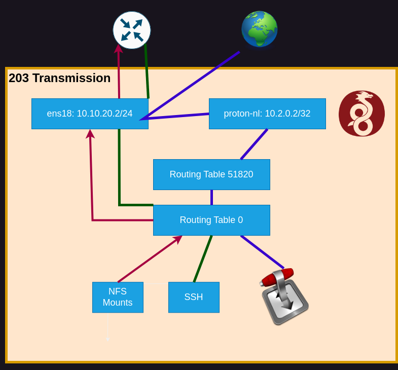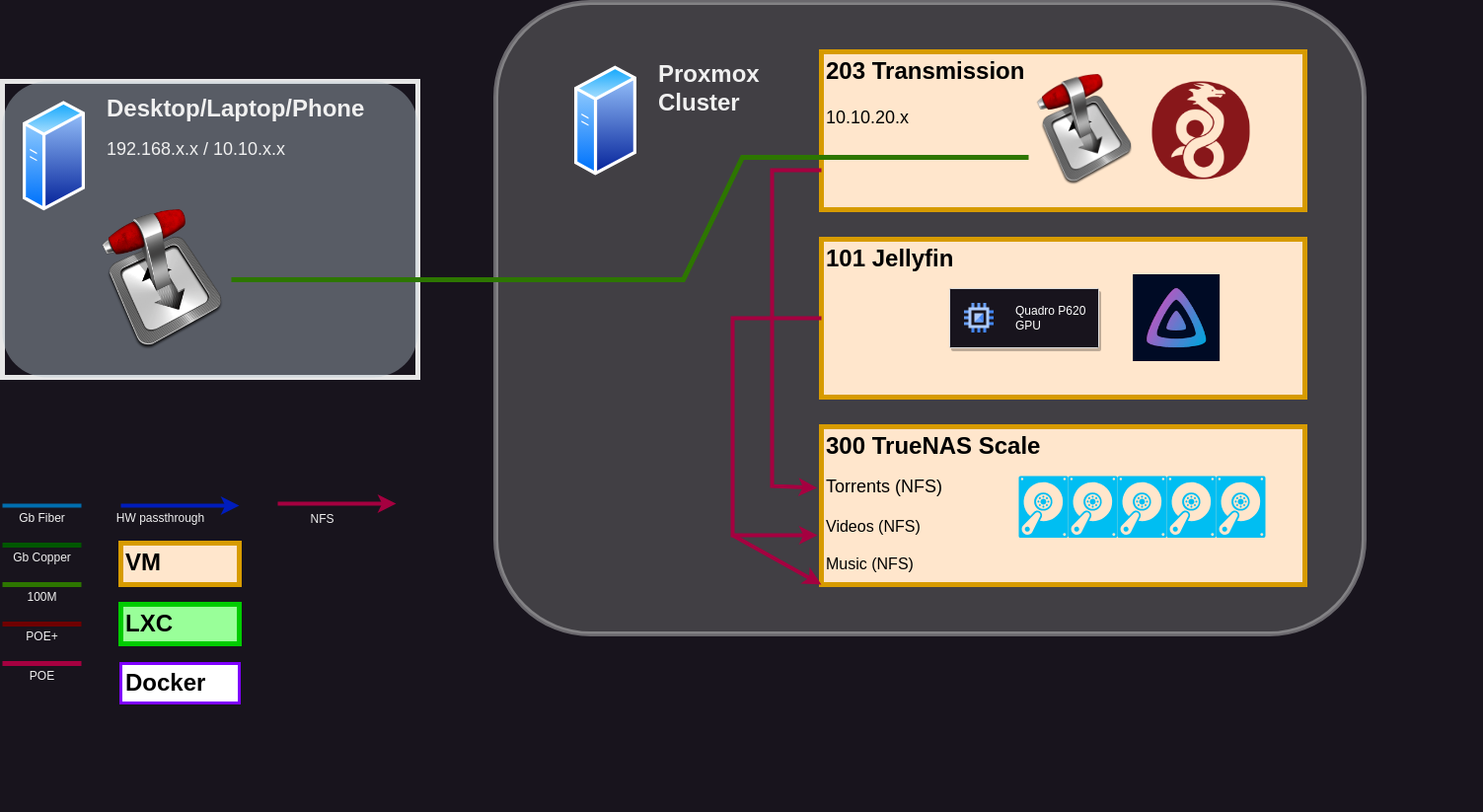 - Desktop/Laptop/Phone on one of the private IP ranges, depending on which device. Connecting to transmission-daemon remotely. NFS/SMB shares mounted, so that I can scrape/rename files before moving them to the appropriate folders.